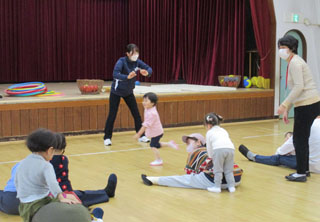 柔軟体操の後に運動家のリズムで踊ったり、鉄棒のぶらさがりやボール遊び競争も楽しみました。…