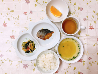 七分つき玄米ごはん さわらの照り焼き 小松菜の信田和え オレンジ 大根とさつまいもの味噌汁…