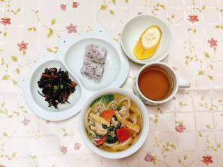 おにぎり(ゆかり) かやくうどん ひじきのツナ煮 バナナ…