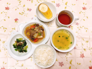 七分つき玄米ごはん すき焼き風煮 ブロッコリーのおかか和え バナナ さつまいもとたまねぎの味噌汁…