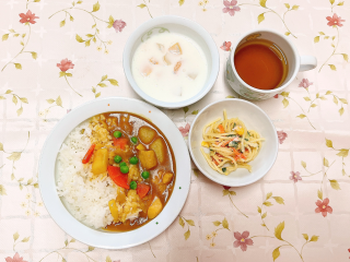チキンカレー スパゲティサラダ フルーツヨーグルト…