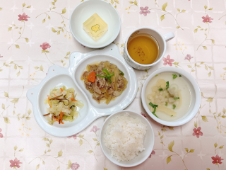 七分つき玄米ごはん 豚肉の生姜焼き キャベツの塩昆布和え りんごゼリー 薄揚げとしめじのすまし汁 …