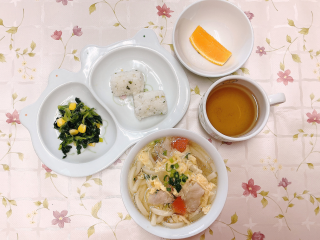 おにぎり(菜飯) 卵とじうどん 小松菜とコーンの和え物 オレンジ…