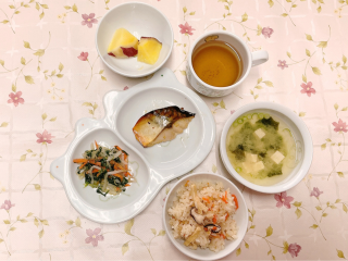 炊き込みご飯 さばの幽庵焼き 春菊ともやしのごま和え さつまいものレモン煮 わかめと豆腐の味噌汁…