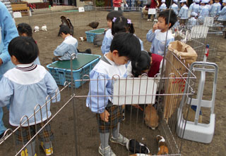 沢山の動物が園に来てくれました。動物の扱い方などの説明を聞いたりした後、ウサギに触れたり、ヒヨコをだっこしたり、ポニーに…