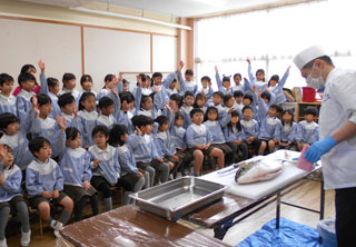 鰤の解体を見てもらいました。包丁の種類や刃を入れるときの音、柵にとりわけ、内臓を見たり、成長するにつれて名前が変わる事を…