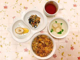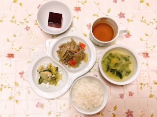 七分つき玄米ごはん 豚肉とごぼうの甘辛炒め 冬野菜のお浸し ぶどうゼリー さつまいもと若布の味噌汁…