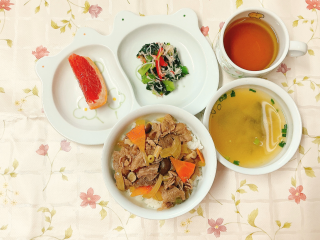 具だくさん牛丼 青菜とかにかまの和え物 グレープフルーツ なすとえのきの味噌汁