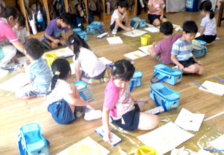 年中組。自画像に肌色を塗りました。頬に作った肌色に朱色を混ぜて塗りました。