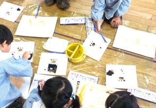 4歳児。自画像を描いています。今回はそれぞれが髪の毛の色を混色して作って、描きました。皆、自分の特徴を良くとらえていました。