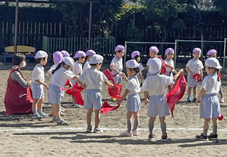 年中組。園庭で運動会の練習をしています。当日は立派な姿を見せてくれると思います。
