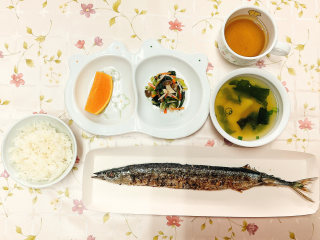 七分つき玄米ごはん 新さんま炭火焼 小松菜ときのこのポン酢和え オレンジ さつまいもとわかめの味噌汁