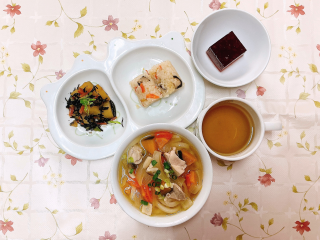 おにぎり(にんじん飯) ほうとう風うどん じゃがいもとひじきの煮物 ぶどうゼリー