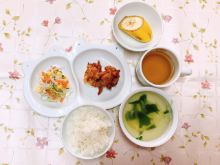 七分つき玄米ごはん 鶏肉のからあげ 大根サラダ バナナ コンソメスープ