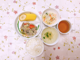 七分つき玄米ごはん 豚肉と野菜の味噌炒め 春雨の酢の物 バナナ 大根とえのきのすまし汁