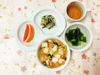 七分つき玄米ごはん 五目マーボー豆腐 三色ナムル グレープフルーツ 中華スープ