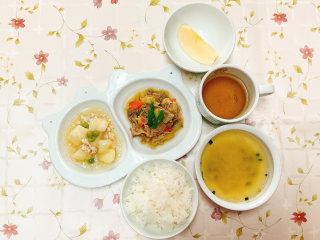 七分つき玄米ごはん 豚肉と野菜の生姜炒め じゃがいものそぼろあんかけ りんご しめじと玉ねぎの味噌汁