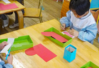 12月の壁面制作のブーツです。赤い靴と白い綿の部分を切りました。