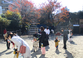 『みんなであそぼう』の日です。園庭で赤や黄色の落ち葉を拾い、紐に付けたり、落葉の冠作りをしました。