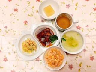チキンライス ミートローフ きのこソースがけ スパゲティサラダ ももゼリー コンソメスープ