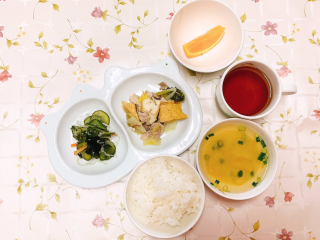 七分つき玄米ごはん 厚揚げと白菜の炒め煮 きゅうりとしらすの酢の物 オレンジ えのきと薄揚げの味噌汁