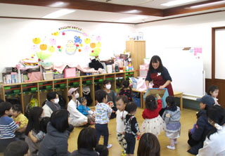 みんなで遊ぼうの日でした。園庭で遊んだ後、歌に合わせて鈴を鳴らしたり、ツリーの制作を楽しみました。