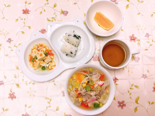 おにぎり(わかめ) ちゃんぽん麺 高野豆腐の卵とじ オレンジ