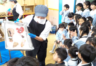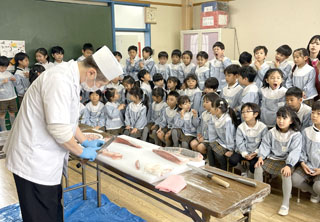 鰤の解体を見てもらいました。包丁の種類や刃を入れるときの音、柵にとりわけ、内臓を見たり、成長するにつれて名前が変わる事を教わり、ブリしゃぶにするところを見ました。後で、鰤しゃぶをみんなでいただきました。全4枚