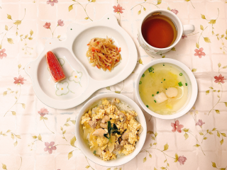 親子丼 切干大根煮 グレープフルーツ 白菜と麩の味噌汁