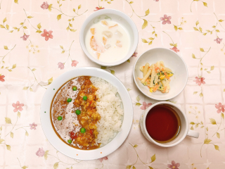 キーマカレー マカロニサラダ フルーツヨーグルト