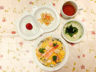ひなちらし寿司 大根と油揚げの炊いたん いちご 手まり麩とわかめのすまし汁