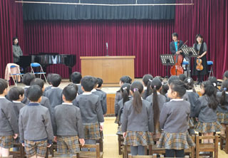 13日の卒園式を前に、バイオリンとチエロの担当者も参加して練習をしました。