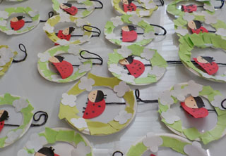 紙皿を使ったてんとう虫のリースを制作しました。画用紙をちぎって貼ったり、ペンを使って顔と身体の模様を描きました。2026.03.23