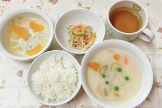 七分つき玄米ごはん 春野菜シチュー 切干大根とツナのサラダ フルーツポンチ