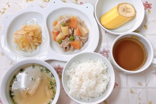 七分つき玄米ごはん 新じゃがの肉じゃが 春キャベツと桜えびのお浸し バナナ 舞茸と油揚げの味噌汁