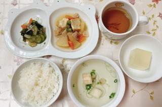七分つき玄米ごはん 鶏肉と厚揚げの五目煮 きゅうりとしらすの酢の物 グレープフルーツゼリー