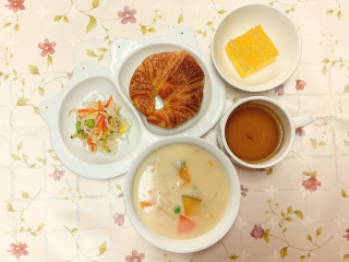 クロワッサン 南瓜のクリームシチュー 彩りサラダ みかんとりんごのゼリー…