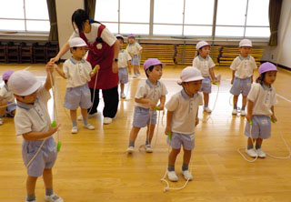 3歳児の体操の様子です。縄跳びを手に持ち飛び越える基礎を練習しました。…