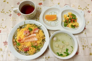 お花見ちらし寿司、スナップエンドウの卵炒め、オレンジ、豆腐と手鞠麩のすまし汁…