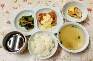 七分づき玄米ごはん、チキン南蛮、きゅうりとわかめのごま和え、バナナ、なめこと大根の味噌汁…
