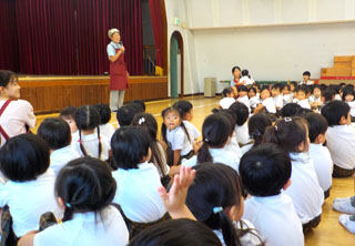 始業式。ホールに集まって園歌を歌を唄ったり、2学期についての園長先生からのお話を聞きました。(全2枚) …