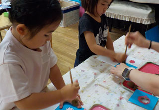 敬老の日のプレゼントを作っています。筆でコスモスの花粉や周りの模様を描きました。…